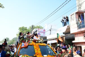कड़े सुरक्षा इंतजाम और भारी पुलिस बल की तैनाती के बीच यह रोड शो रेलवे स्टेशन से शुरू होकर मुख्य बाजार, रामराज रोड मंडी के सामने जाकर समाप्त हुआ।