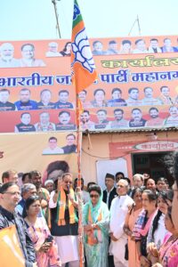 भारतीय जनता पार्टी के 45 वें स्थापना दिवस के अवसर पर अपने निजी आवास तथा भाजपा महानगर कार्यालय में पार्टी का झंडा फहराते कैबिनेट मंत्री गणेश जोशी