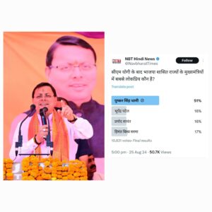 बड़ी खबर: प्रतिष्ठित मीडिया समूह नव भारत टाइम्स के सर्वे में टॉप पर मुख्यमंत्री धामी