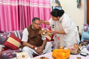 इस अवसर पर बहनों ने मंत्री जी को आरती उतारकर तिलक लगाया और उनके दीर्घायु होने की कामना की। मंत्री ने भी बहनों को उपहार स्वरूप मिठाई व शुभकामनाऐं भेंट की।